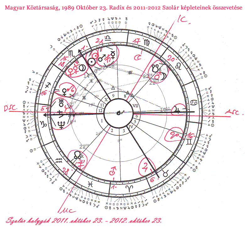 Ha ránézünk a Szolár képletünkre, tisztán látható a Radix képlethez képest az Ascendens-Descendens tengelyek felcserélődése, valamint hat bolygókapcsolat és két teljesen azonos fényszög ismétlődése. Vagyis ami az "alapvetésben" a kiindulási állapotban, azaz a `89-es a Radix képletben lefektetődött, most problémák és megoldandó feladatok formájában ismét hangsúlyossá válik!