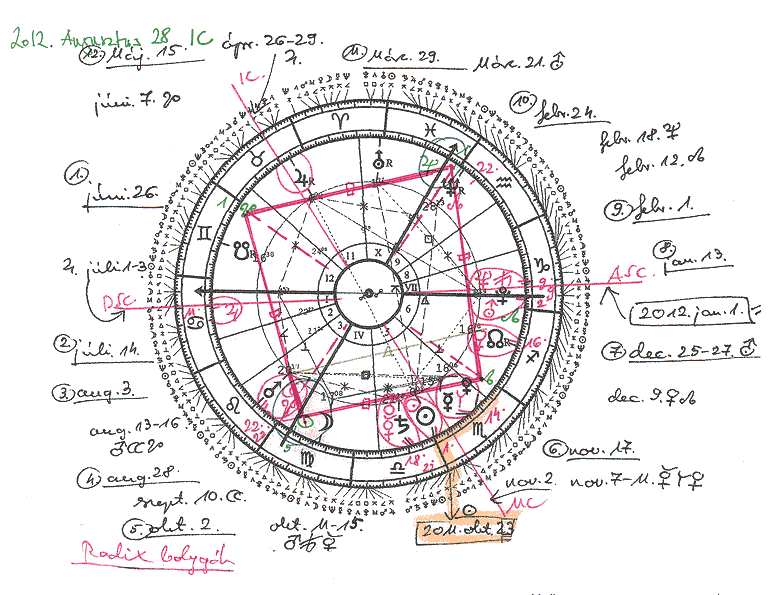 Szolár képletünkben tehát augusztus az Oroszlán Mars az uralkodói erőt, önbizalmat, öntudatot, akaratot jelzi. Azonban ennek a tenniakarásnak a kinyilvánításában az aktív erő és a boldogasszonyi, passzív minőség helyes viszonyát kell megélnünk. Nem szabad félreértelmeznünk "elmúlt életünket", a tudatalattinkban megbújó uralkodói voltunkat (Oroszlán leszálló Holdcsomópont). Így nem szabad a jelen korban meg nem élt, elrejtett nagyságunkat, hatalomvágyból fakadóan, egyéni szándékoknak kiszolgáltatva, öntelten bizonygatnunk, "odamondogatnunk". A tranzit, a Szolár és Radix képletekben megismétlődő Mars-Szaturnusz együttállásai, illetve a Szolár Merkúr kedvező fényszöge az erők összeadására, egymással való párbeszédre, kompromisszumkézségre, az ésszel-szívvel való mérlegelésre, az együttműködésre és a helyes időzítésre szólít bennünket.