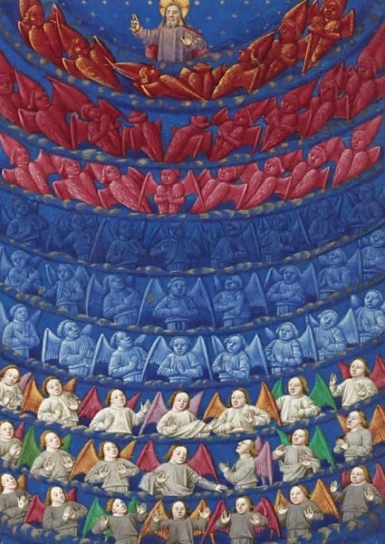 Az angyalok három hármasságban, kilenc karban állnak Isten körül: