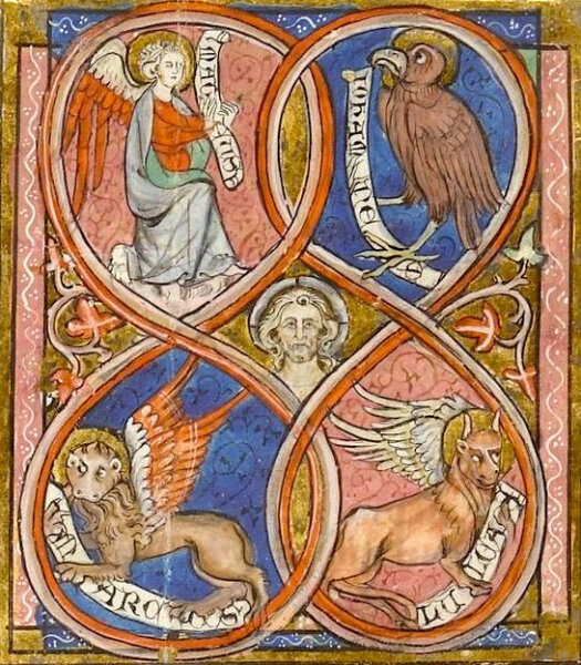 Ez a négyszög megfelel a négy evangélistának is: Oroszlán – Márk, Bika – Lukács, Ember – Máté, Sas – János. Fontos azonban látni: nem azért, mert a kereszténység születésekor így álltak volna a napéjegyenlőségek és napfordulók, hanem mert a „négyesség” szimbóluma már az ősi mezopotámiai–perzsa világképből öröklődött. A Bronzkorban a tavaszpont valóban a Bika csillagkép táján állt, a többi főpont pedig az Oroszlán–Skorpió–Vízöntő irányokban – ekkor született a „négy királycsillag” hagyománya, mint az évszakok őrei. A keresztény szimbolika ezt a nagy, ősi képet vette át, és kapcsolta hozzá az evangéliumokhoz: így íródott össze a kozmikus rend és az evangélium egyetlen nagy szakrális képpé.