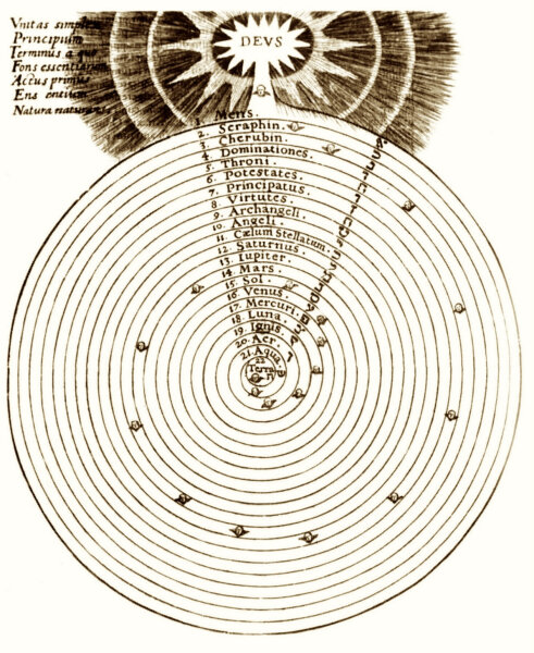 A középkori keresztény gondolkodás – különösen a 12. századi misztikus, Honorius Augustodunensis (Elucidarium című művében) – úgy tartotta, hogy a bolygók mozgása mögött nem vak erő, hanem isteni értelem áll, amelyet angyalok közvetítenek. Honorius (kb. 1080–1150) enciklopédikus szerző volt, aki műveiben a csillagászatot, a liturgiát és a teológiát összefonva mutatta meg a kozmosz isteni rendjét.
